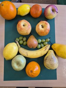Abschluss-Ausstellung der Winterkunst- Bilder im Schulhaus. Die grünen Smileys zeigen die Ergebnisse der Evaluierung des Projekts. Die Kinder waren begeistert…